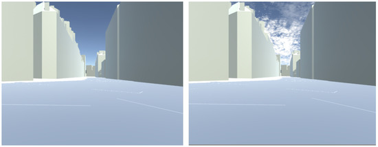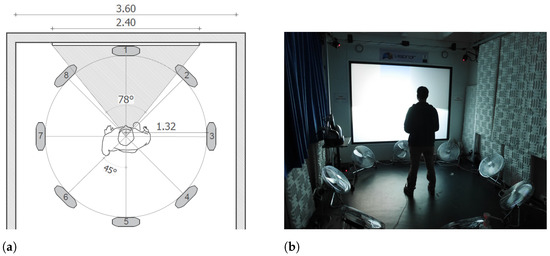 We decided to rely on the arrangement proposed by Verlinden et al. in [39] because the size and distance of the fans they used allowed them to generate an impact of the wind on the participants’ bodies, unlike the small fans used at the level of the VR helmet. This effect more closely resembles the wind perceived in a real urban environment. In addition, the power of the fans makes it possible to generate stronger winds that allow for simulating the resulting wind effects in a real situation. The authors in [39] used eight fans at the top of the experimental room. We decided to locate them at ground level (see in Figure 2b) as participants were to be oriented to look up to see the buildings and wind flow in the virtual scene. We used the following fan model: ProBreeze 20” chrome floor fan (ProBreeze, London, UK) (each fan has 3 predefined speeds: 2.2 m/s, 2.6 m/s and 3.3 m/s measured at the participant position in the VR room). They were located around the user of the device at a 1.32 m distance (see in Figure 2). This room is equipped with a 1.80 m-high by 2.40 m-wide screen, offering a horizontal field of view of 78°. Regarding the sound, we equipped the participants with Plantronics-Backbeat Go 410 (Poly, San Jose, CA, USA) Bluetooth headphones which had a double function: on the one hand, to allow for the sound rendering of the virtual scene, and on the other hand, to reduce the ambient noise of the room (resulting from the fans operation, relays, projector, etc.) with their noise reduction function. Their size was chosen so as not to prevent the tactile influence of wind on the ears of the participants.