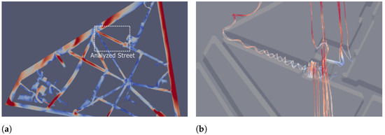 CFD results visualizations (a) horizontal cut of wind speed. (b) Streamlines of wind velocity in the 3D model of the street of interest. Images from [10].