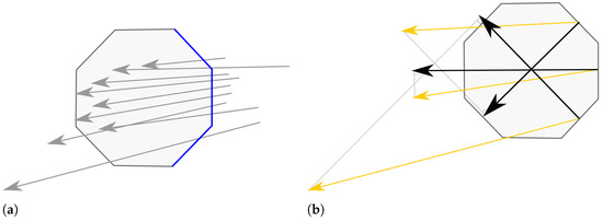 Schematic representation of the virtual octagon. Image from [10]. (a) Vectors identification crossing one of the octagon faces from outside to inside (in blue). (b) Average vector (in yellow) of the wind speed and direction projected on the fan axis (black arrows).