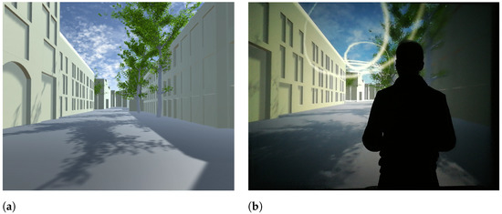 This could also be evaluated in a mixed system between virtual and augmented reality, in which, by means of a virtual twin [53], participants could have a global view of wind behavior of an urban environment projected on a scale model while having the immersive view on the VR projection screen.