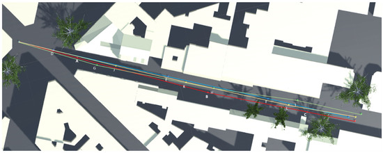 The four different predefined virtual paths on the analyzed street.