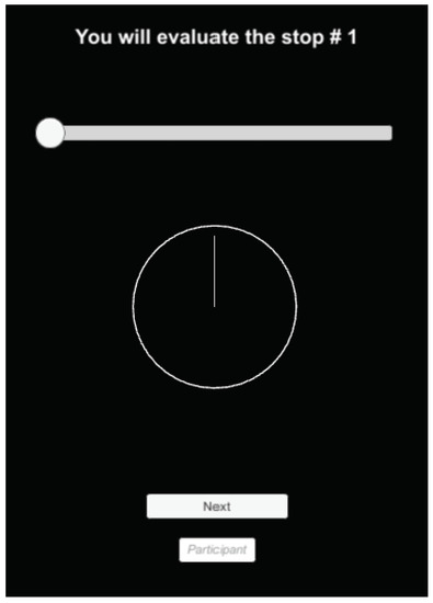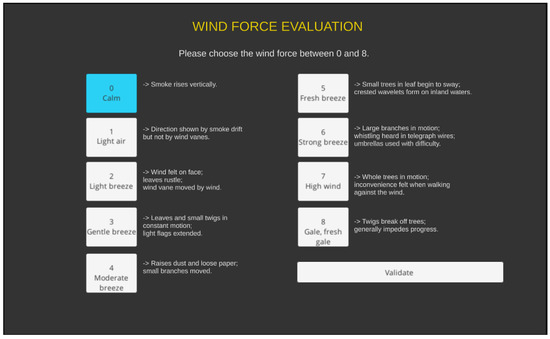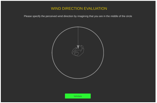 The tablet had an application that indicated the number of the stop to be evaluated and allowed the participants to specify the wind direction in a circle and the wind force in a slider from 0 (corresponding to no wind) to 10 (corresponding to the maximum reference value (see in Figure 9). These evaluations were to be made based on the resulting wind behavior at the stop points, which remained constant during the evaluation. At the end of each path, the participants had to evaluate their sense of presence in the virtual scene with a Slater–Usoh–Steed (SUS) questionnaire [49]. Then they continued the experiment with another type of representation.