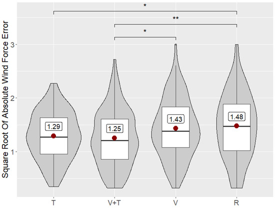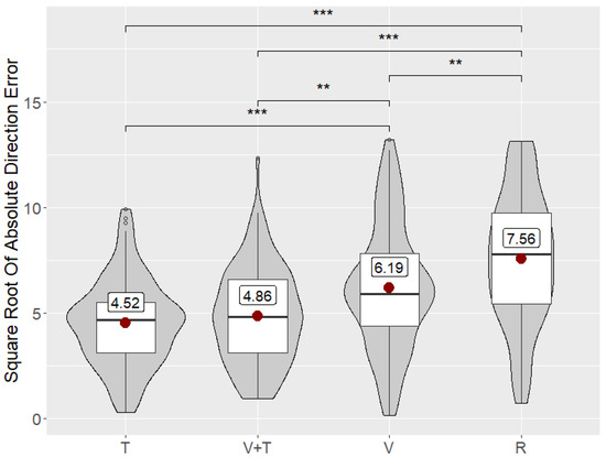 - H1: V is more accurate for understanding wind direction compared to T. Both in the real world and in virtual reality, a visual preeminence exists: the visual sense supplies much more data to our brain, and at a much greater speed than other senses [48]. By assuming visual preeminence, we believe that the wind flow visualization can bring more accurate information about the wind direction.