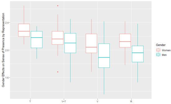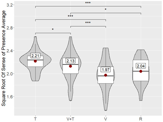 - H5: T is more accurate for increasing the sense of presence in the VR scene compared to V. Previous studies [6,37,39,40] have shown that tactile effects increase the sense of presence in a VR scene compared to an audiovisual representation. We assume the wind flow visualization (V) in our study will be consistent with those previous works.