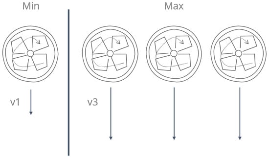 To integrate the tactile restitution of the wind in the immersive device, we implemented communication between the virtual scene from Unity3D (V.2018.3.9f1, Unity Technologies, San Francisco, CA, USA) and the fans using a Velleman-VMA101 (Velleman Group nv, Gavere, Belgique) card (based on ARDUINO-Mega2560 (Arduino)) and a relay module. The latter works as an intermediary between the card and the fans. It allows for the passage of electric current to the fans according to the signal coming from the microcontroller. This signal is produced in Unity3D by defining when the fans should be turned on and at what speed. We modified the housing of the speed control buttons for each fan so that we could digitally control them.
