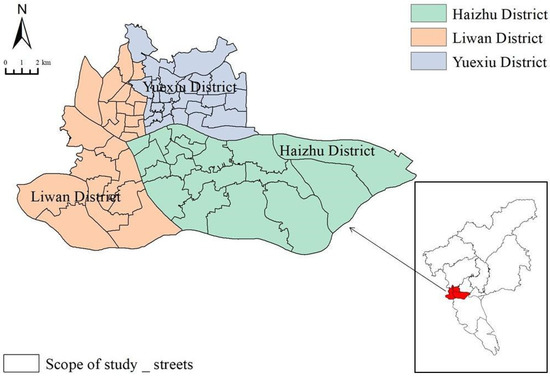 Guangzhou, the capital city of Guangdong Province, located in the south of China, has one of the most aging populations in China. The three central districts of Guangzhou (i.e., Haizhu, Liwan, and Yuexiu) are the three areas with the most prominent aging-related challenges, with the proportion of the elderly population over 15%. Therefore, the three central districts (Figure 1) were selected as the areas for this study. Among them, Haizhu District includes 18 streets, Liwan District includes 22 streets, and Yuexiu District includes 22 streets.