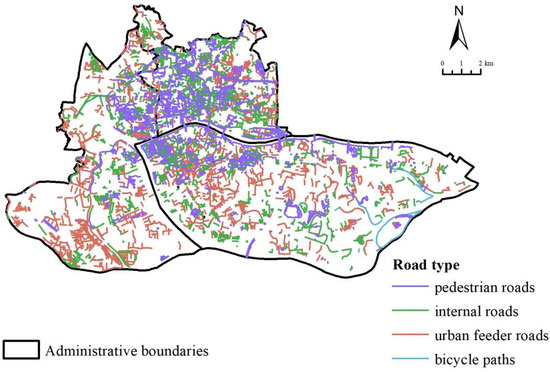 Road network data are mainly used to determine the sampling points of Streetscapes. OpenStreetMap (OSM) is included as the data source of the road network in the research area, which contains detailed classification of road grades and types. As we are mainly concerned with streets where elderly people do recreational physical activities, we only study the pedestrian roads, internal roads, urban feeder roads, and bicycle paths. Figure 2 shows the spatial distribution of the studied roads.
