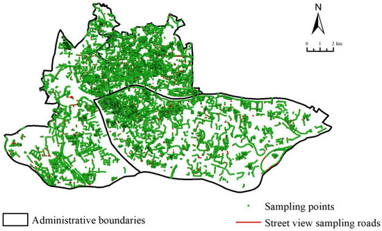 First, the road network data is preprocessed by road type correction, topology correction, and geometry correction. Then, the Streetscape sampling points are obtained according to 100 m equal interval sampling, and 14,787 points can be obtained after a de-duplication process. Last, the latitude and longitude of the sample points are calculated by ArcGIS as the parameters for collecting Streetscape data. The spatial distribution is shown in Figure 3.