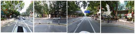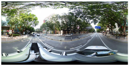 Streetscape data are from https://lbsyun.baidu.com/ (accessed on 20 March 2020). This paper collects Streetscape images of Yuexiu, Haizhu, and Liwan districts. First, we set the pitch angle of each sampling point to 0° (horizon angle). Then, we search the nearest Streetscape map within the scope based on the latitude and longitude coordinates of the sampling points gained by the Baidu panoramic coordinates pickup tool. Later, we apply the program to parse its URL address, and automatically combine the panoramic map tile data in its background to obtain a complete static panoramic image of 360° horizontal range of the point, which is a typical rectangular spherical panoramic image [25], as shown in Figure 4. Last, the computer segmentation program is used to expand the panorama into pictures in four directions, namely front, right, back, and left (i.e., 0°, 90°, 180° and 270°), which is shown in Figure 5. Eventually, a total of 14,569 panoramic pictures is obtained after removing useless data. These panoramic pictures represent 58,276 street images after being expanded, which are used for evaluating the street space quality.