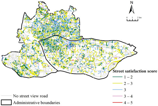 As can be seen in Figure 7, the scores of the street space quality of senior citizens’ physical leisure activities in Guangzhou’s three central districts are mainly in two sections, 2–3 point and 3–4 point. Few streets are scored 1 or 5. The average value of the overall satisfaction is 2.6, which shows great room for improvement in street space quality. Streets with satisfaction of 4–5 have more green views, more sidewalks, and fewer people, vehicles, and buildings. Many of them are distributed near parks.