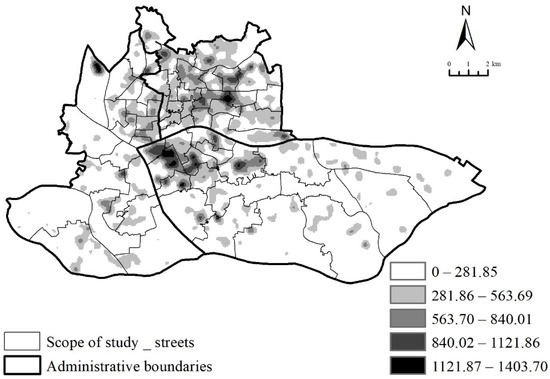 Spatial Distribution of Kernel Density of Street Space Quality. Note: Kernel density calculates the density of point features around each output raster cell.