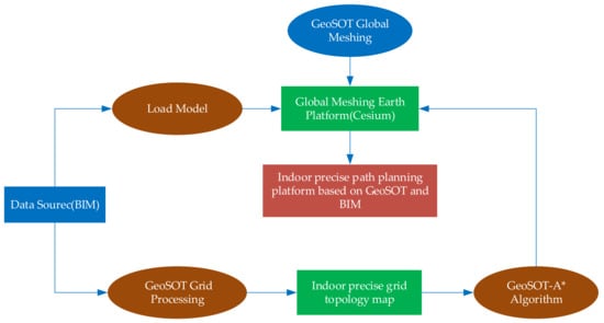 This section mainly introduces the method proposed in this paper in detail, and the general idea is shown in Figure 1. In the first scenario, by relying on the Cesium platform [17,18,19], the 96 BIM model is used as the data source to load the earth space decomposed into a multi-scale, nested space, three-dimensional grid system according to the GeoSOT subdivision technology. In the second scenario, the BIM model is meshed to generate an indoor precise mesh topology map, combined with the GeoSOT-A* algorithm, to achieve precise indoor path planning.
