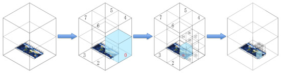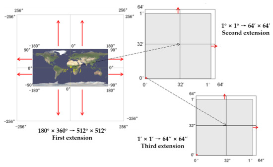 GeoSOT is a set of global subdivision grids centered on the intersection of the prime meridian and the equator [20,21], and is divided into two-dimensional space and three-dimensional space. A 32-level multi-scale grid system is formed according to quadratic recursive division and octagonal recursion [22,23]. The core idea is to extend the earth space of the original latitude and longitude system three times (Firstly, the traditional earth region of 180° × 360° is extended to 512° × 512°, and then the longitude and latitude of 60 decimal degrees is virtually extended to 64 decimal degrees, 1° is extended to 64′, and 1′ is extended to 64″). Then, with the difference in the longitude and latitude of the Earth as the division range, the quadtree dissection of the whole score and whole degree is carried out for each level, and, finally, a 32-level quadtree dissection grid system of equal longitude and latitude is formed [24,25,26], as shown in Figure 2. In the same way, for three-dimensional space, it is also through three expansions of the Earth. The Earth space is expanded to 512° × 512° × 512°, and then 1° is expanded to 64′ and 1′ is expanded to 64″. We implemented recursive octree partitioning [26] for whole degrees, minutes, and seconds, as shown in Figure 3. The GeoSOT grid level table is shown in Table 1.