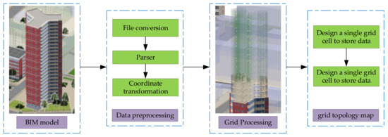 The indoor precise grid map is the premise of precise path planning. To generate an indoor precise grid map, it is necessary to analyze and process the BIM model data source, design the size and level of the subdivision grid, and design the data stored in a single grid unit, as shown in Figure 5. The specific steps are as follows: