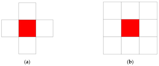 Neighborhood location calculation. (a) Four neighborhoods; (b) Eight neighborhoods.