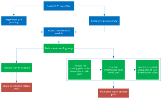 Before path planning, first the indoor grid map needs to be generated as described in detail in the previous section. Then, for the BIM model after model information extraction and the GeoSOT meshing, under the premise of fully considering the size of the door, the distribution of obstacles, and the spatial connection relationship of each floor in the indoor environment, indoor path planning can be divided into single-layer path planning and multi-layer path planning. The GeoSOT-A* algorithm flow is shown in Figure 9.