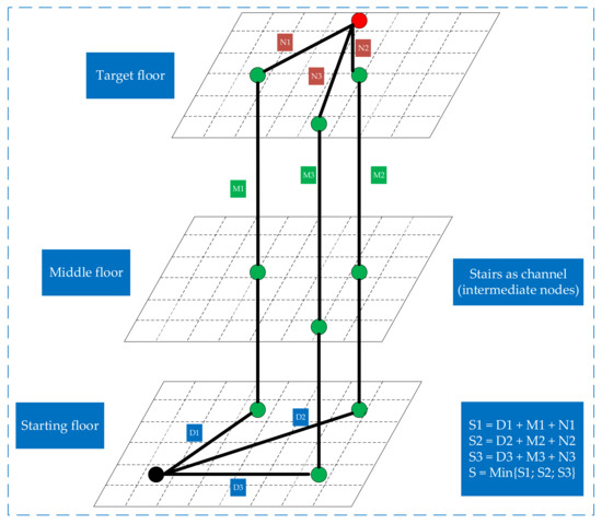 - In the third method, the computer adopts the indoor path planning method based on BIM (Building Information modeling) technology [10,11,12,13,14,15,16]. Using the BIM model as the data source for path planning, and traversing all the nodes in the model through an algorithm, the indoor path can be obtained. However, this method is more suitable for the situation of simple building structure and a few room units. Traversing all nodes takes a lot of time, thereby affecting the optimality of the path. It lacks the efficient use of the building’s own geometry and attribute information, as well as the consideration of the internal spatial topology of the building. It is difficult to meet the indoor multi-layer continuous path planning needs of the space.