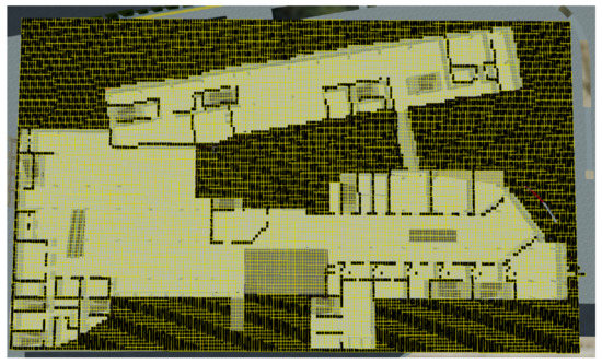 - The BIM model analyzes and generates an indoor grid topology map. As mentioned above, by analyzing the BIM model, the coordinates and attribute information of each component in the building model are obtained. Then, after the coordinate conversion processing, the WGS84 geographic coordinates of each component on the three-dimensional sphere are obtained. According to the indoor grid map generation steps described above, the grid map inside the BIM model is obtained, as shown in Figure 14. In this map, black indicates impassable areas, light colors indicate passable areas, and each mesh is associated with the attributes of specific entity components inside the model, such as key information like stair passages.