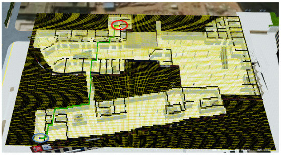 - From the experimental results shown in Figure 12 and Figure 13, it can be concluded that it is indeed feasible to apply GIS technology-related ideas to the BIM model. Indeed, the method fuses the GeoSOT grids with real geographic information and building information models and enables indoor path planning. For these results, the GeoSOT grid makes up for the deficiency of the BIM model having all the attribute information of the indoor building and lacking the real geographical location attribute.