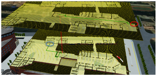 - The topology of the floor grid after meshing the BIM model is displayed in the whole interface, and the optimal path planning diagram from the starting position to the target position is shown. Set the starting point and target point, the blue circle indicates the starting position, the red circle indicates the target position, the green indicates the planned path, and the red column indicates the channel between floors. The experimental results of single-floor path planning are shown in Figure 15 and the experimental results of multi-floor path planning are shown in Figure 16. This experiment proves the correctness and feasibility of the path planning analysis method based on GeoSOT and BIM, and also proves the correctness and feasibility of the GeoSOT-A* algorithm designed in this paper.