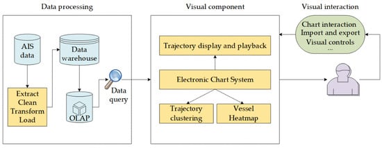This paper designs a visual analysis system to explore vessel behaviour and statistically analyze vessel traffic flow. Figure 1 shows the workflow of the system and mainly includes three parts: a data processing module, a visual component module, and a visual interaction module.