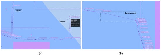 (1) The data processing module mainly realizes data preprocessing and storage. Due to the high sampling rate and multiple sources of AIS data, the amount of data is large and there is duplication. In order to facilitate storage and calculation, the original data need to be deduplicated and compressed. Due to equipment problems, AIS data is prone to noise and data missing (as shown in Figure 2), so it is necessary to denoise and repair the trajectory data. The visualization of large-scale trajectory data cannot be carried out by interactive visual analysis because of its large storage capacity and slow query acquisition. This paper uses data warehouse [34] to manage data, which can effectively reduce the calculation cost of the system and improve the work efficiency of the system.