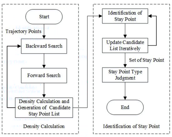 Identifying and analyzing vessel stay points (berthing points, anchoring points) is an important part of trajectory analysis. It can not only provide necessary basic information for the safe navigation and berthing of vessels, but also provide important decision support for port planning and construction. However, the existing methods either do not consider the time continuity of trajectory points, or only consider the time continuity, resulting in insufficient recognition ability of stay points. Based on the literature [42], this paper presents a density-based identification method of vessel stay points which considers the spatiotemporal aggregation of trajectory points and takes into account the time continuity and directivity of trajectory points. The algorithm mainly includes three steps: density calculation, stay point identification, and type judgment. Figure 3 shows the framework of stay point detection algorithm.