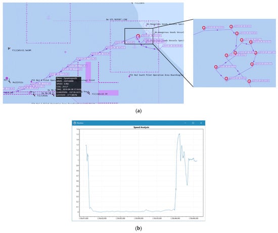 Single-vessel trajectory display: (a) the trajectory display of a single vessel; (b) speed analysis.