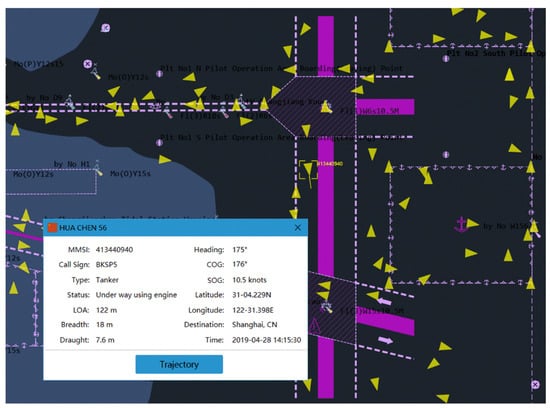 Vessel trajectory playback is widely used in the fields of vessel violation identification, accident investigation, evidence collection, etc. Figure 7 is an example of multi-vessel trajectory playback at the Yangtze River Estuary at a certain time on 28 April 2019. Double-clicking the yellow vessel AIS target activates the target. The static and dynamic information of the target can be viewed in the information window. The speed and progress of trajectory playback are controlled by a sliding bar, and the starting, pausing, and stopping of playback are controlled by buttons. During playback, the vessels’ historical trajectories can be selectively displayed.