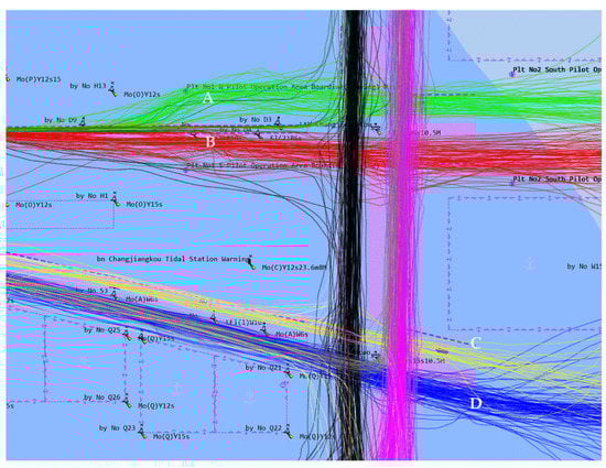 Vessel trajectory clustering can be used to find the motion patterns of vessels, analyze movement rules, and detect abnormal behaviour of vessels. In this paper, the FastDTW algorithm and the OPTICS algorithm are used to realize fast vessel trajectory clustering. Figure 8 shows the clustering results of vessel trajectories in the Yangtze River Estuary from 1 to 3 April 2019. Trajectories with the same flow direction and adjacent distances in the figure are clustered together, and different trajectory clusters are distinguished by color. The differences and similarities among traffic flows (clusters) can be intuitively found through color difference. By comparing the static and voyage reports of vessels, it can be seen that the draft of all vessels in traffic flows A and B in the figure is above 7 m, while the draft of all vessels in traffic flows C and D is below 7 m. Therefore, it can be concluded that “the north channel is the exclusive channel for vessels with larger draft, and the south channel is the exclusive channel for vessels with smaller draft”, which is consistent with actual navigation. Through the study of the vessel trajectories in the traffic flow, the differences and similarities of the vessels in the traffic flow can be further found, such as the subtle differences in the vessel type and voyage time of the vessels in the cluster.