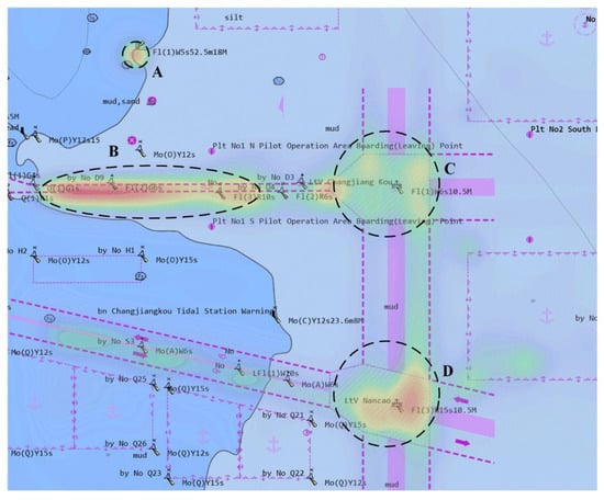This paper designs a vessel heatmap, uses color to reflect the data, and shows the distribution and density trends of vessels from the perspective of space and time. Figure 9 shows the vessel heatmap at a certain time on 10 April 2019. According to the principle of a heatmap, the darker the red color in the heatmap, the higher the density, so the density of vessels in areas A, B, C, and D in the figure is higher. Generally speaking, there are many vessels in the intersection waters, and the density of vessels is higher there. According to the ship routing system of the Yangtze River Estuary, it can be seen that areas B, C, and D in the figure are the intersection waters, which proves the effectiveness of the heatmap to a certain extent. By continuously observing the heatmap of the waters, it can be found that the density of vessels in areas B, C, and D changes greatly before and after high and low tides, while the density of vessels changes relatively little at other times. In navigation practice, vessels generally take the tide to enter and exit the estuary at high and low tide times, and the density of vessels in waters B, C, and D is relatively high at this time, which also proves the effectiveness of the heatmap to a certain extent.