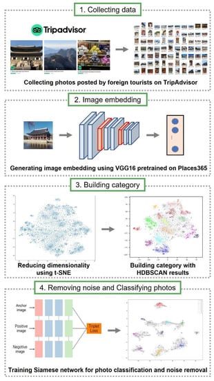 The analysis process of this study is shown in Figure 1. First, we extracted the photos posted on TripAdvisor and then selected the photos posted by foreign tourists, excluding Koreans using the publisher’s country of origin and the language used in writing the review. Second, we embedded individual images as 512-dimensional feature vectors using a VGG16 network pre-trained on the Places365 dataset. Third, we reduced each vector to two-dimension with t-SNE, employed HDBSCAN to cluster these photos, and set this as an image category. Fourth, we used Siamese Network to remove noise images not included in categories and classify photos according to the category.
