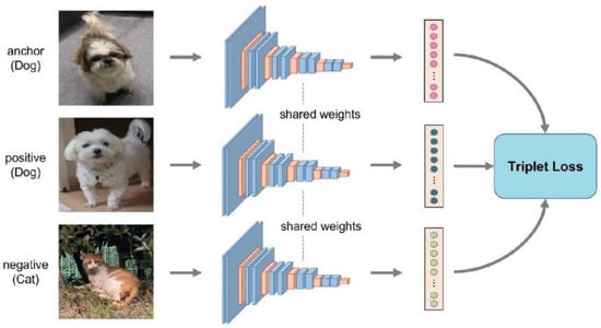 In this study, triplet loss was used as a cost function for training the Siamese network, and semi-hard was used among triplet mining methods. The triplet loss function receives three types of input data: anchor, positive, and negative. There are three ways to construct input data: easy triplets, hard triplets, and semi-hard triplets. Schroff et al. revealed that the model trained using the semi-hard triplets’ method is superior among them [28]. Figure 2 shows the architecture of the model used in the study.