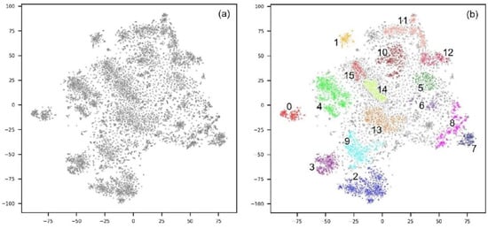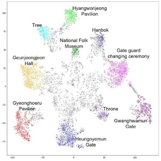 A total of 9940 photos were collected in 10,655 reviews registered on TripAdvisor on the ‘Gyeongbokgung Palace’ page. Out of a total of 9940 photos, we selected 8188 photos except for 715 reviews written in Korean. A VGG16 model pre-trained with Places365 embedded each photo in a 512-dimensional vector, and t-SNE reduced the vectors to two dimensions. We implemented HDBSCAN to cluster these vectors into several groups. The result is shown in Figure 4, and the number of photos for each cluster is shown in Table 1. Sixteen clusters were generated and 3824 points were classified as noise.