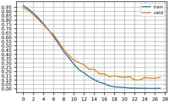 To improve the ability of the model for pattern extraction through nonlinearity, two convolutional layers were added to the basic structure of the VGG16 network. The model used in this process had weights pre-trained on Places365. These weights had been fine-tuned with our own dataset. Figure 5 shows the change in the loss value in the process of the model training. To prevent overfitting, we trained the model up to epoch 18.