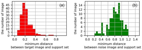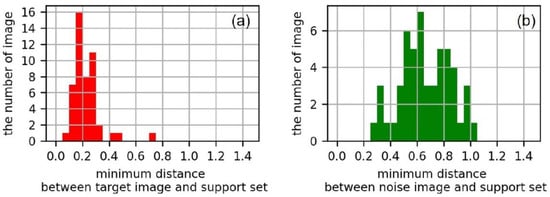 Histogram of Gyeongbokgung Palace: (a) minimum distance between a target photo set and reference set; (b) minimum distance between a noise photo and reference set.