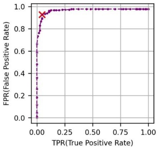 Siamese network learns to position the images with similar visual content close to each other in vector space and vice versa. Based on this principle, photos can be classified, and noises can be detected. For this, a target set, a noise set, and a reference set are needed. The target set is a set of target photos to be classified and labelled according to category items. A noise set is a set of noise photos that do not belong to the category. The reference set consists of sample images of each category. Test sets and reference sets were made to consist of a similar number of photos for each category. The noise set was made with a similar number of photos to the test set. Photo classification and noise removal are performed through the following four steps: First, the distance between a target photo and the photo belonging to the reference set is calculated respectively. Second, the prediction label of the target image is assigned as a label of a reference photo having a minimum distance in Equation (4). These processes are repeated for all target images. Third, the distance between a noise photo and the photo belonging to the reference set is calculated, respectively. This step is repeated for all photos in the noise set. As a result, noise photos can be deleted by setting a threshold for the minimum distance. Fourth, the accuracy of prediction was evaluated as the minimum distance threshold was changed using the ROC curve. The threshold of the point showing the best accuracy was selected. The ROC curve is a graph showing how the performance of the classification system changes according to various thresholds. In this study X and Y axes of the ROC curve are True Positive Rate (TPR) and False Positive Rate (FPR). TPR is the percentage of cases where the true label matches the predicted label in the target set in Equation (5). FPR is the percentage of cases where noise is not classified as noise in Equation (6). The optimal threshold is the value of the point farthest from Y = X among points on the ROC curve in Figure 3.