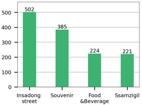 There are 6410 reviews registered on TripAdvisor’s ‘Insadong’ page. Of these, 3695 photos were collected from 5915 reviews written in a foreign language. Each photo was embedded as a 512-dimensional vector, reduced to two dimensions using t-SNE, and clustered using HDBSCAN. Figure 11 shows the result and Table 3 shows the number of photos for each cluster. Of the total 3659 points, 2568 were classified as noise, and 5 clusters were generated in Figure 11b. Since the 134 photos belonging to cluster 4 represent different visual contents such as signs, souvenirs, murals, portraits, and food, the cluster was not considered in the building category. Four categories were finally created as follows: ‘Ssamzigil’, ‘Insadong street’, ‘Food and Beverage’, and ‘Souvenir’.