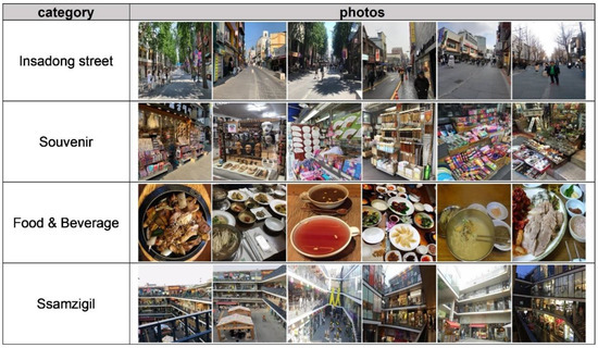 As computer vision technologies have developed, several studies have identified TDI from a number of SNS photos using deep learning methods [15,16,17,18,19,20]. However, they have limitations in classifying photos that represent unique characteristics of tourist attractions. They use predetermined photo categories such as Places365 or ImageNet which are designed for general purposes, so they are not appropriate for identifying the uniqueness of individual attractions. To overcome these limitations, Kang et al. and Yoon and Kang analyzed the images by generating a tourism photo classification category according to a specific area and training the model with training datasets for each category [21,22].