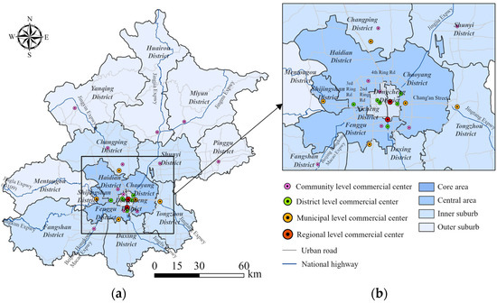 The study area of Beijing: (a) the 16 administrative districts and 4 overall planning zones in Beijing, and (b) the core and central area of Beijing, with different grades of commercial centers.