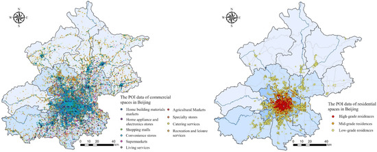 The POI data of commercial and residential spaces are obtained from the 2018 Baidu electronic map and the Lianjia.com data, respectively. A total of 235,549 valid commercial POI data points and 7618 valid residential POI data points were obtained in this research (Table 1 and Table 2 and Figure 2). The POI data of commercial spaces include information such as the merchant name, address, latitude and longitude coordinates, and commercial formats. According to the “Retail Format Classification” national standard in China and the POI data attributes, the commercial formats in Beijing are divided into 10 categories (Table 1). The residential POI data include the name of the residential district, housing price, building age, and latitude and longitude. To ensure the minimum within-group difference and the maximum between-group difference [37], the Jenks natural breaks algorithm is applied to divide the housing prices into three groups of residential space: high-grade (106,600–280,100 RMB/m2), mid-grade (61,300–106,500 RMB/m2), and low-grade (10,000–61,200 RMB/m2).