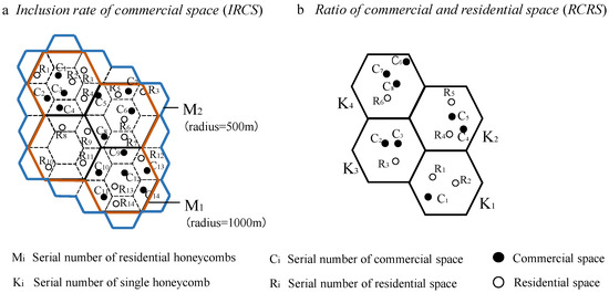 The spatial association relationship between commercial and residential spaces can be analyzed from two perspectives: macroscopic overall association degree and microscopic local association type. The macroscopic association degree measures the overall spatial proximity of the commercial and residential spaces. The local association type is the spatial combination mode of the commercial and residential spaces in a specific region. The honeycomb grid method can both measure the macroscopic association degree and local association type between commercial and residential spaces [40]. In this study, a hexagonal honeycomb grid is laid out in the study area to analyze the spatial association between commercial and residential spaces within each hexagon. The specific indicators of the honeycomb grid analysis are inclusion rate of commercial space (IRCS) and ratio of commercial and residential space (RCRS).