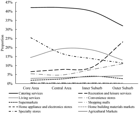 The distribution of each commercial format in Beijing from the inside out can be found in Figure 4. The proportions of catering services, specialty stores, and shopping malls in all commercial formats of each circle gradually decrease in the outward direction. The proportions of living services and supermarkets appear to increase first and then decrease, with living services accounting for the highest proportion in the central area and supermarkets accounting for the highest proportion in the inner suburb. The proportion of convenience stores shows a trend of first decreasing and then increasing, with the lowest proportion in the central area. The proportions of recreation and leisure services and agricultural markets show a trend of increasing in the outward direction, with the highest proportions in the outer suburb. In general, the commercial spaces of catering services, living services, and specialty stores need to be near the living and shopping areas of customers, and these three commercial formats have the widest spatial distribution within the city. Commercial formats with very high market demand (e.g., convenience stores, supermarkets, and agricultural markets) are also distributed widely. Recreation and leisure services, which include a variety of subdivided commercial formats, present a particularly obvious trend of suburbanization. Commercial formats present in small numbers with large service areas (e.g., shopping malls, home building materials markets, and home appliance and electronics stores) are distributed dispersedly.