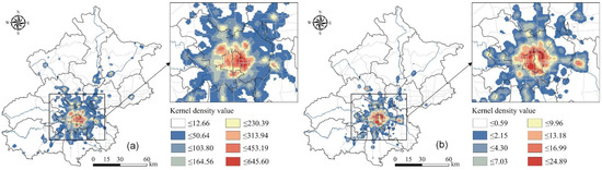 Estimated kernel density of commercial and residential spaces in Beijing: (a) the overall commercial spaces, and (b) the overall residential spaces.