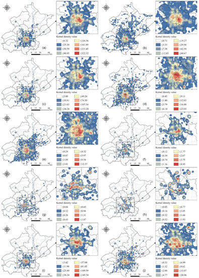 Estimated kernel density of various commercial formats in Beijing: (a) catering services, (b) recreation and leisure services, (c) living services, (d) convenience stores, (e) supermarkets, (f) shopping malls, (g) home appliance and electronics stores, (h) home building materials markets, (i) specialty stores, and (j) agricultural markets.