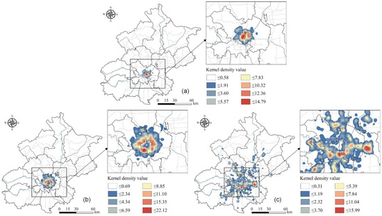 Estimated kernel density of various residential spaces in Beijing: (a) high-grade residential spaces, (b) middle-grade residential spaces, and (c) low-grade residential spaces.