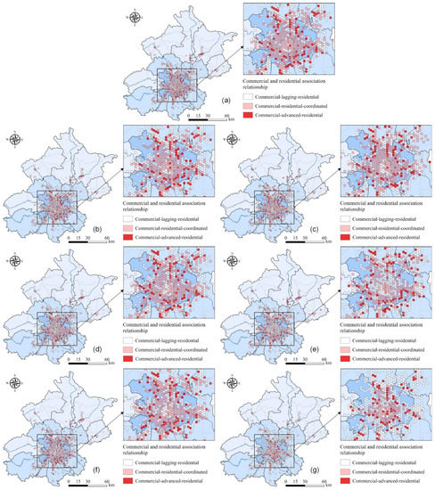 Significant spatial heterogeneity exists in the association relationships of different commercial formats and residential spaces in Beijing. (1) For catering services, the coordinated type, lagging type, and advanced type account for 47.80%, 37.34%, and 14.86%, respectively. Specifically, the coordinated type and advanced type are mainly concentrated within the central area. Outside of the Fourth Ring Road of Beijing, the advanced type is also distributed along the main roads and spreads to district centers in the inner and outer suburbs. Affected by the clustered distribution of government agencies, the lagging type is distributed within the Second Ring Road of Beijing. (2) For recreation and leisure services, the coordinated type, lagging type, and advanced type account for 52.45%, 31.91%, and 15.63%, respectively. The advanced type is mainly concentrated outside of the Fourth Ring Road of Beijing, and several honeycombs of the advanced type are located in the center of each district in the inner and outer suburbs. (3) For living services, the proportion of coordinated type (49.61%) and lagging type (47.16%) is approximately the same. The area within the Fourth Ring Road is dominated by the coordinated type. Some lagging type exists in the core area. The distribution of advanced type is similar to that of catering services. (4) For convenience stores, the coordinated type accounts for a relatively large proportion (44.57%). The proportion of the lagging type in the northern part within the Fourth Ring Road is relatively large. More advanced type exists for convenience stores in the southern part of the city than in the northern part of the city. (5) For supermarkets, the lagging type accounts for a relatively large proportion, 44.57%, mainly concentrated in the inner and outer suburbs and the Xicheng District within the core area. The coordinated type (38.37%) is mainly concentrated in the central area and the inner suburb, and the advanced type (17.05%) is concentrated in the district-level and community-level commercial centers. (6) For shopping malls, the lagging type accounts for 68.60%. The coordinated type (18.35%) and the advanced type (13.05%) are concentrated within the Fourth Ring Road. Specifically, the advanced type is concentrated in the regional level and municipal level commercial centers. Although the lagging type accounts for the largest proportion in the inner and outer suburbs, one or two honeycombs of the advanced type are still formed in the center of each district in the inner and outer suburbs. (7) For home appliances and electronics stores, the lagging type (accounting for 81.27%) is the most widely distributed in Beijing. The advanced type is scattered as a dotted layout mainly distributed in the areas around Shijingshan Road and in the centers of each district. (8) For the home building materials markets, the lagging type accounts for 88.37%. The coordinated type (accounting for 3.88%) is scattered in the central area. The advanced type (accounting for 7.75%) is concentrated in the southern part of the central area around the Fourth Ring Road. Additionally, one or two honeycombs of advanced type are formed in the center of each district in the inner and outer suburbs. (9) For specialty stores, the coordinated type (accounting for 52.07%) is widely distributed in the central area and part of the inner suburb. The advanced type (accounting for 11.76%) is scattered in the vicinity of the main roads. Because some specialty stores for cultural and creative products are clustered in the Palace Museum and other tourist attractions, the advanced type is also concentrated in these areas. (10) For agricultural markets, the coordinated type with residential space (accounting for 56.46%) is widely distributed. The advanced type (accounting for 11.63%) is mostly distributed in the range from the Fourth Ring Road to the border of the central area and is also concentrated in the southern region of the city.