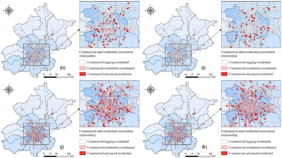 The distribution of association relationships between commercial and residential spaces in Beijing: (a) the overall commercial spaces, (b) catering services, (c) recreation and leisure services, (d) living services, (e) convenience stores, (f) supermarkets, (g) shopping malls, (h) home appliance and electronics stores, (i) home building materials markets, (j) specialty stores, and (k) agricultural markets.