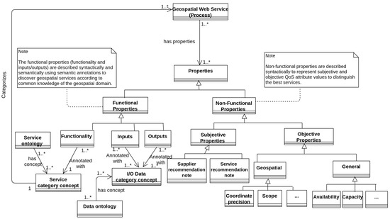 In the context of GWS discovery, in order to refine functional matching results, a number of geospatial research studies [29,30,31,32] take into account the non-functional matching step, often referred to as constraints satisfaction, preferences satisfaction or, also, the service recommendation step. The non-functional matching step exploits non-functional properties (availability, cost, database quality of gazetteer, etc.), which are most often QoS (Quality of Service) attributes. This step is used to assist the user in their selection. It follows the functional matching step if it proposes several services that are functionally similar. The non-functional matching methods are varied. They are closely related to the non-functional attributes considered and the evaluation model used (real numbers, interval numbers, linguistic expression, ontology concepts, etc.). To our knowledge, a critical requirement today is to consider the non-functional properties of geographic information according to the different categories of geospatial services.