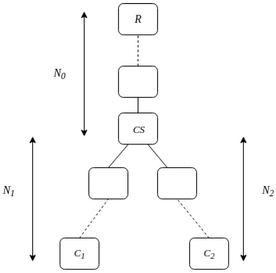 Given an ontology formed by a set of concepts and a root concept R, and represent two of its concepts, on which, the similarity will be calculated. The principle of the computation is based on the distances , and , separating root concept R, concept and concept from the closest common ancestor (see Figure 3). The that assigns a score is defined in Equation (1).